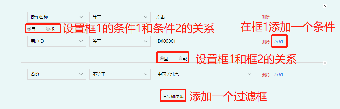 - 点击【添加过滤】后新增一个过滤框,框和框之间的关系通过中间的“且”和“或”设置。