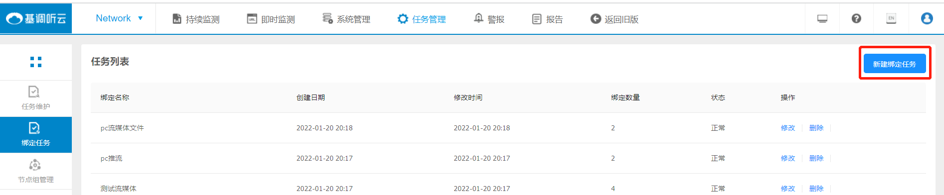 在上方菜单栏中单击任务管理,然后在左侧选择绑定任务,进入绑定任务列表页面。