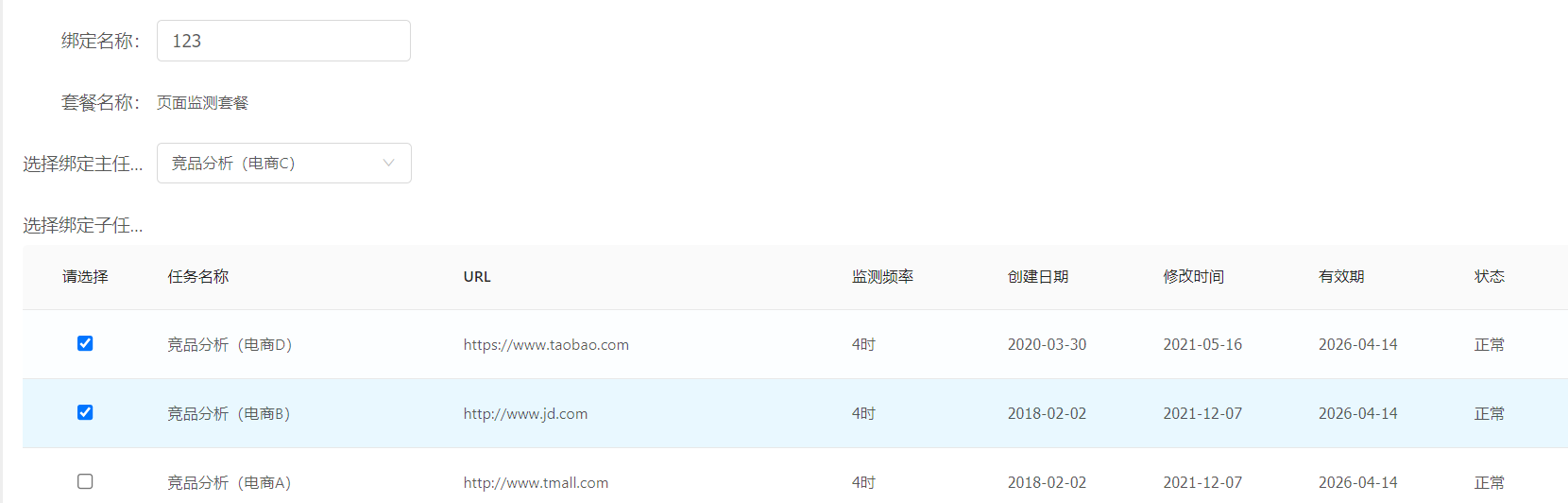 - 监测类型、到期时间、节点组、监测频率、浏览器类型一致的任务才可以建立绑定关系。