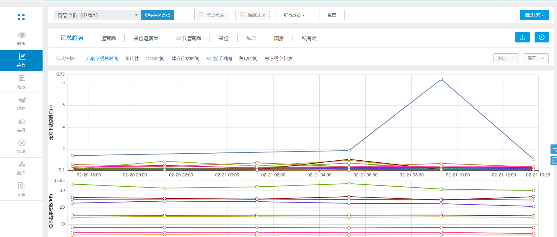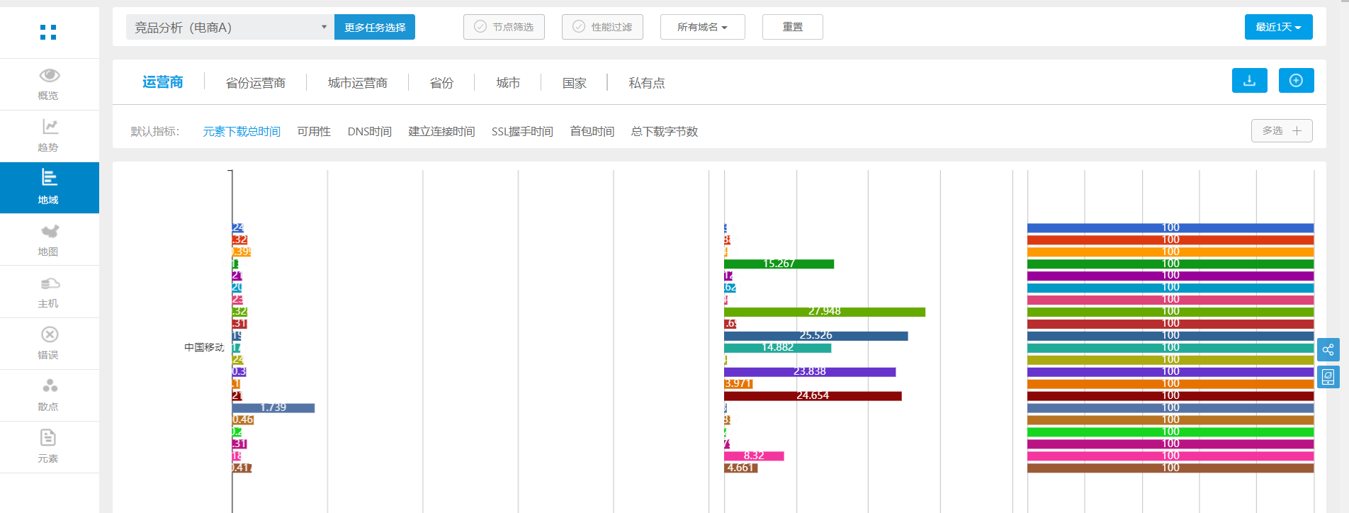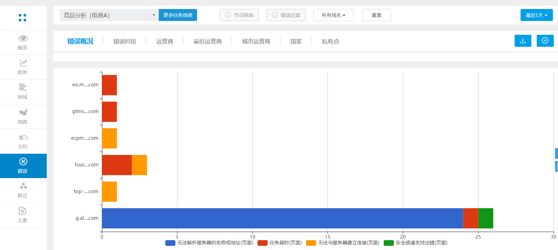 域名分析是对页面下的所有元素域名进行数据分析,展现每一个域名的性能变化情况,通过各个维度进行分析评估,包括时间、城市、运营商、指标、错误,并且每一个域名的性能都可以进行追溯,追溯发生问题的域名下的元素列表。