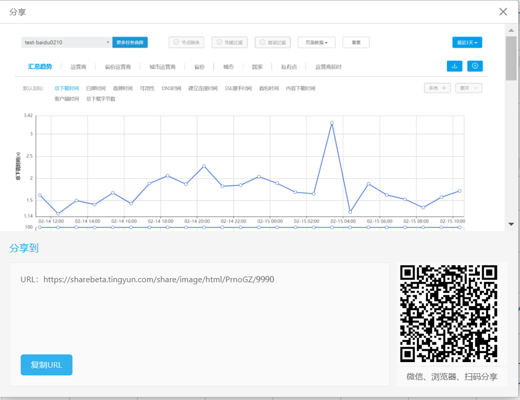 单击复制URL即可将当前生成的分享页面,通过链接的形式在各类协同工具中进行分享。针对移动端,用户还可以将二维码发送给对方,对方通过微信或浏览器扫描即可查看分享内容。