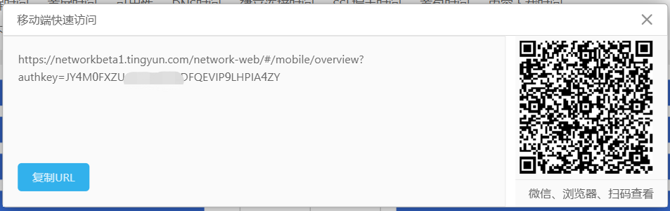 单击复制URL即可将各类型持续监测任务的监测数据以及警报信息,通过链接的形式发送到移动端,对方可在移动端快速浏览上述信息。还可以将二维码发送给对方,对方通过微信或浏览器扫描即可查看任务监测数据。