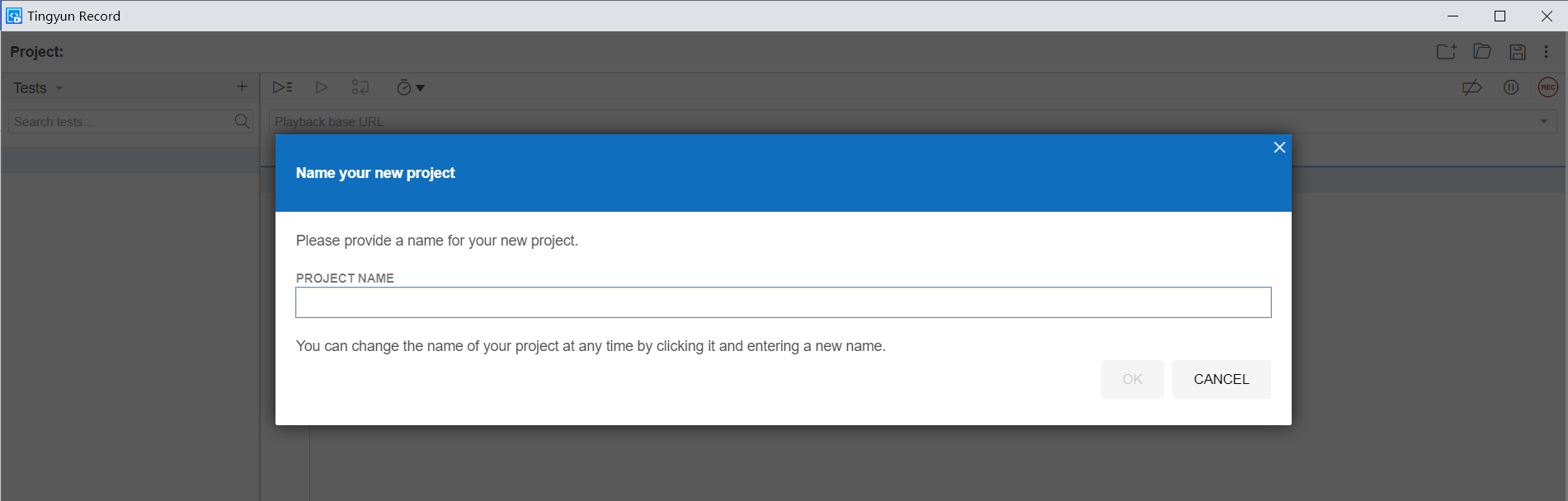 设置测试的主URL(设置好就即可开始录制,稍后再录制可以选择CANCEL取消)。