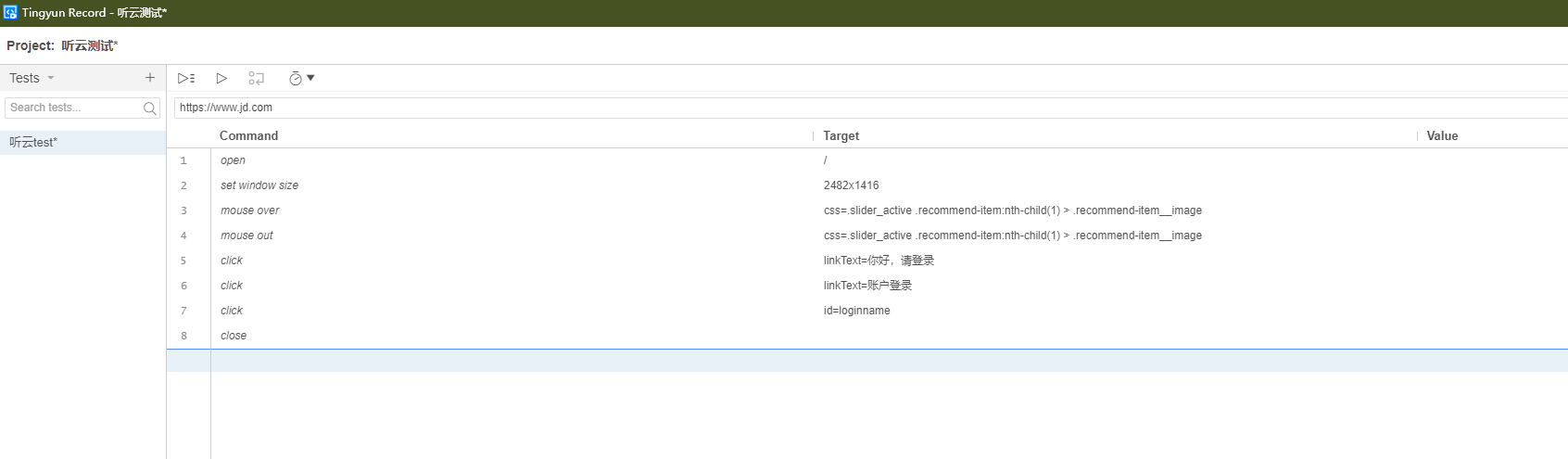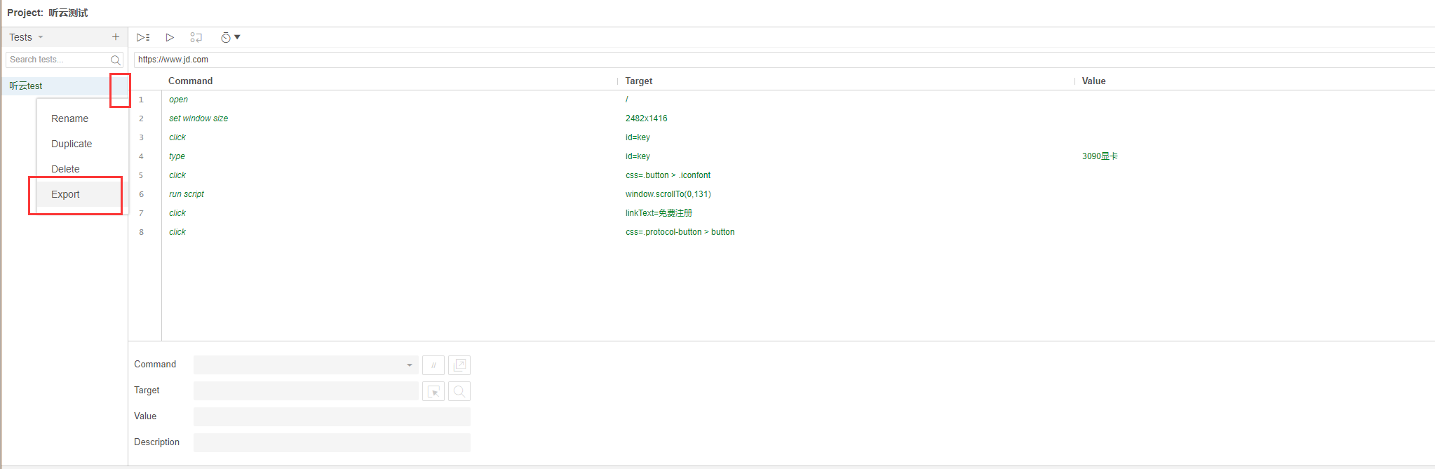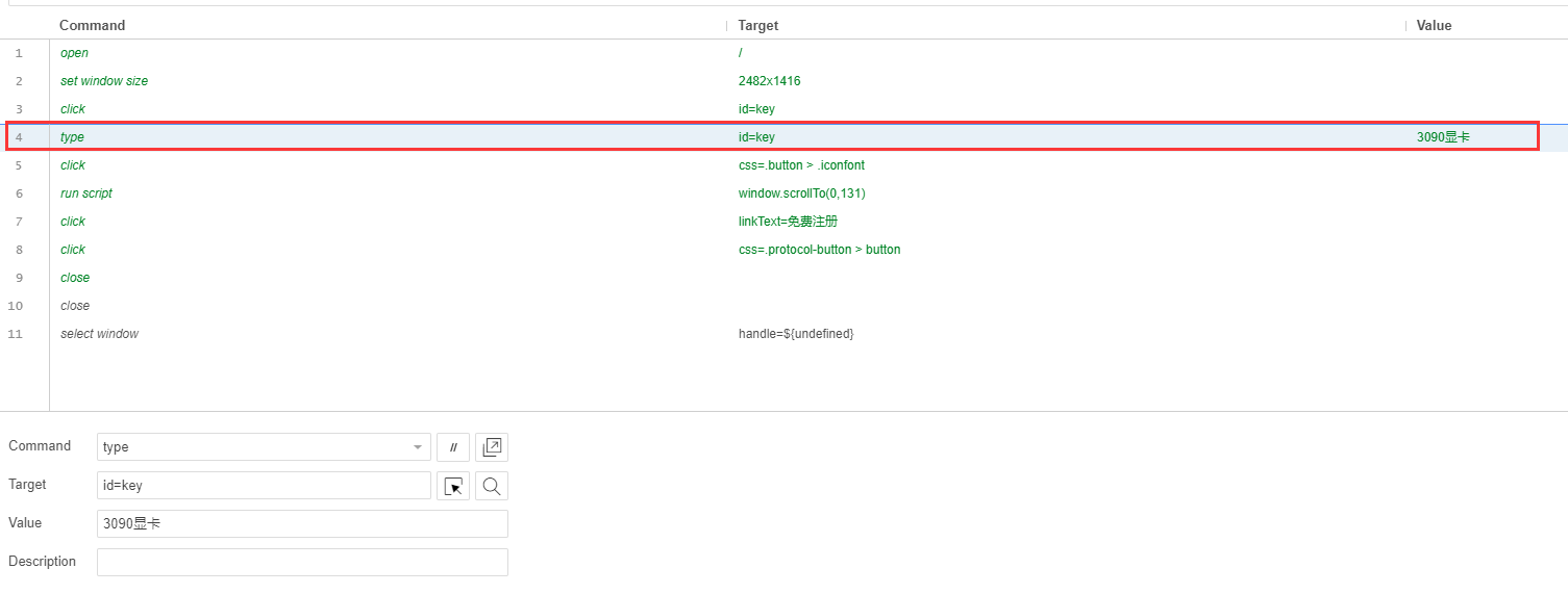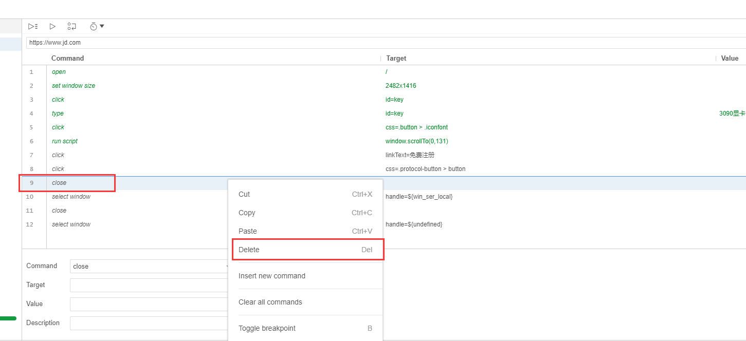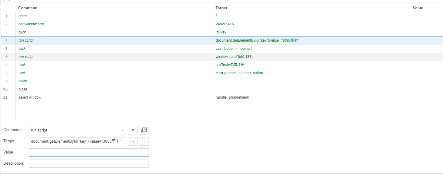 https://www.baidu.com不要写成www.baidu.com或者baidu.com。脚本展示区:展示脚本内容的区域,脚本以列表形式展示每一个动作,右键单击个动作可以进行操作。主要用于后期脚本调试。脚本每一个动作基本由三部分组成:command、Target、vlaue。一个动作不一定三个部分都用到。