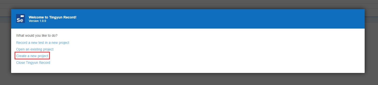 这是一个讯问,需要做什么。如果是第一次使用则选第一个:录制一个测试用例在一个新项目中。后续选择第二或第三个都可以。第四个则是关闭录制器。