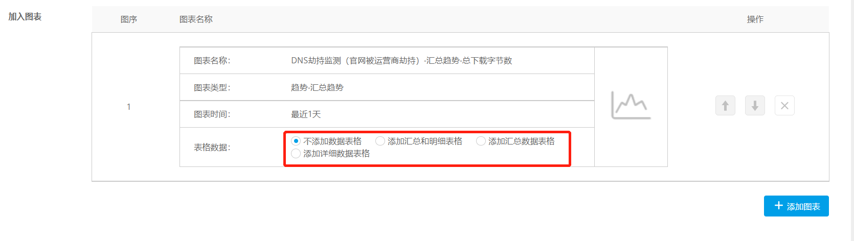 报告中展示的所有数据都依赖于图表池中的图表。单击添加图表按钮,可将图表池中的图表添加到报告中。报告中用户可添加多个图表,这些图表可由不同的监测任务及不同的报表类型组成。添加后,可在红框中选择是否添加与图表相对应的汇总和详细数据表格。单击操作列的图标,可移动图表的展示顺序,也可删除图表,不展示在报告中。