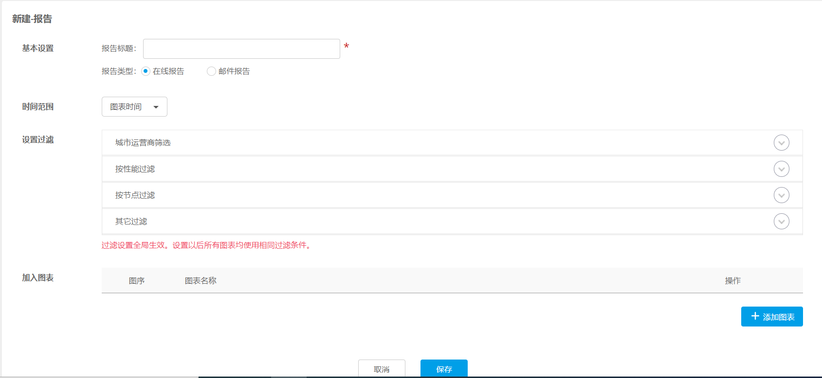 设置过滤:设置报告中图表数据的展示范围。设置过滤以后所有图表均使用相同的过滤条件,所有图表在添加时自带的过滤条件都会被重置。