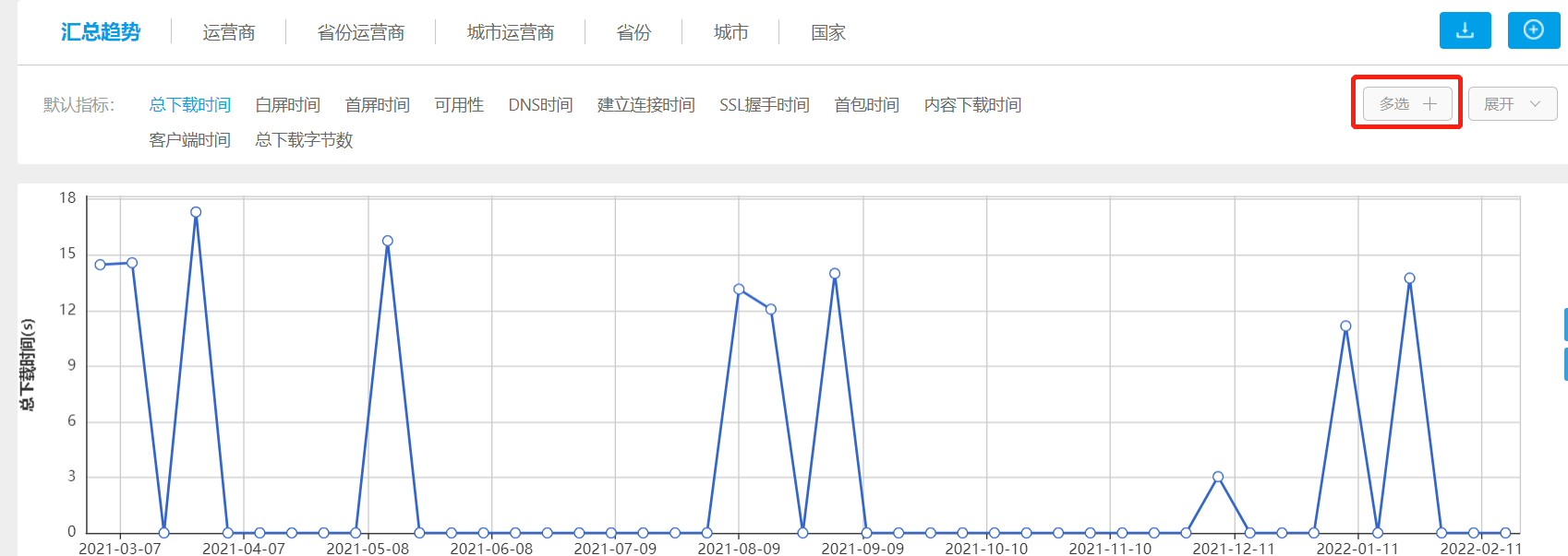 单击页面右上角的继续添加图表,可跳转到持续监测概览页面。单击要添加图表的任务名称,进入该任务的趋势页面中。单击多选按钮,选择要统计的指标,即要添加到图表池的指标。