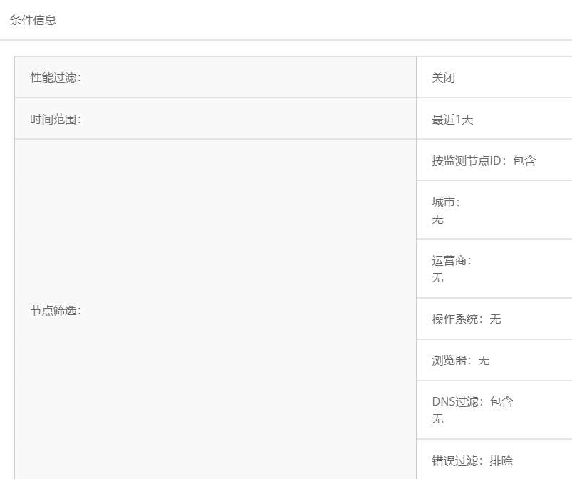 按节点过滤:用户可选择按监测节点IP/ID过滤监测数据,支持包含和排除2种方式。多个节点IP或节点ID用半角逗号“,”号分隔。当上面选择的时间范围超过3个月时,按节点过滤不生效。
