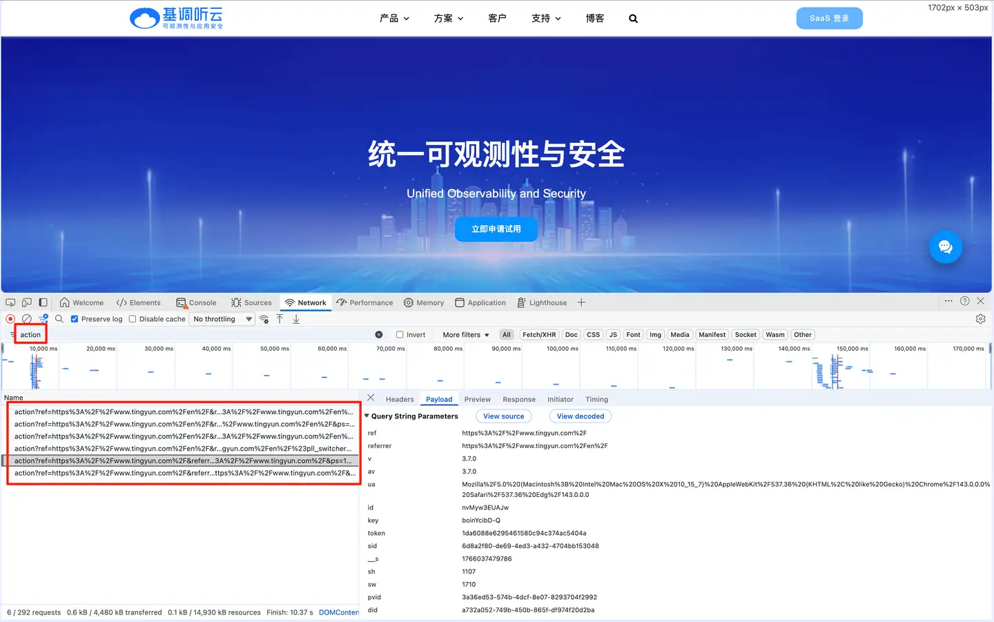 通过Chrome浏览器访问嵌码页面,按F12,然后在network中搜索 “action”,若有action接口数据,即为嵌码成功。