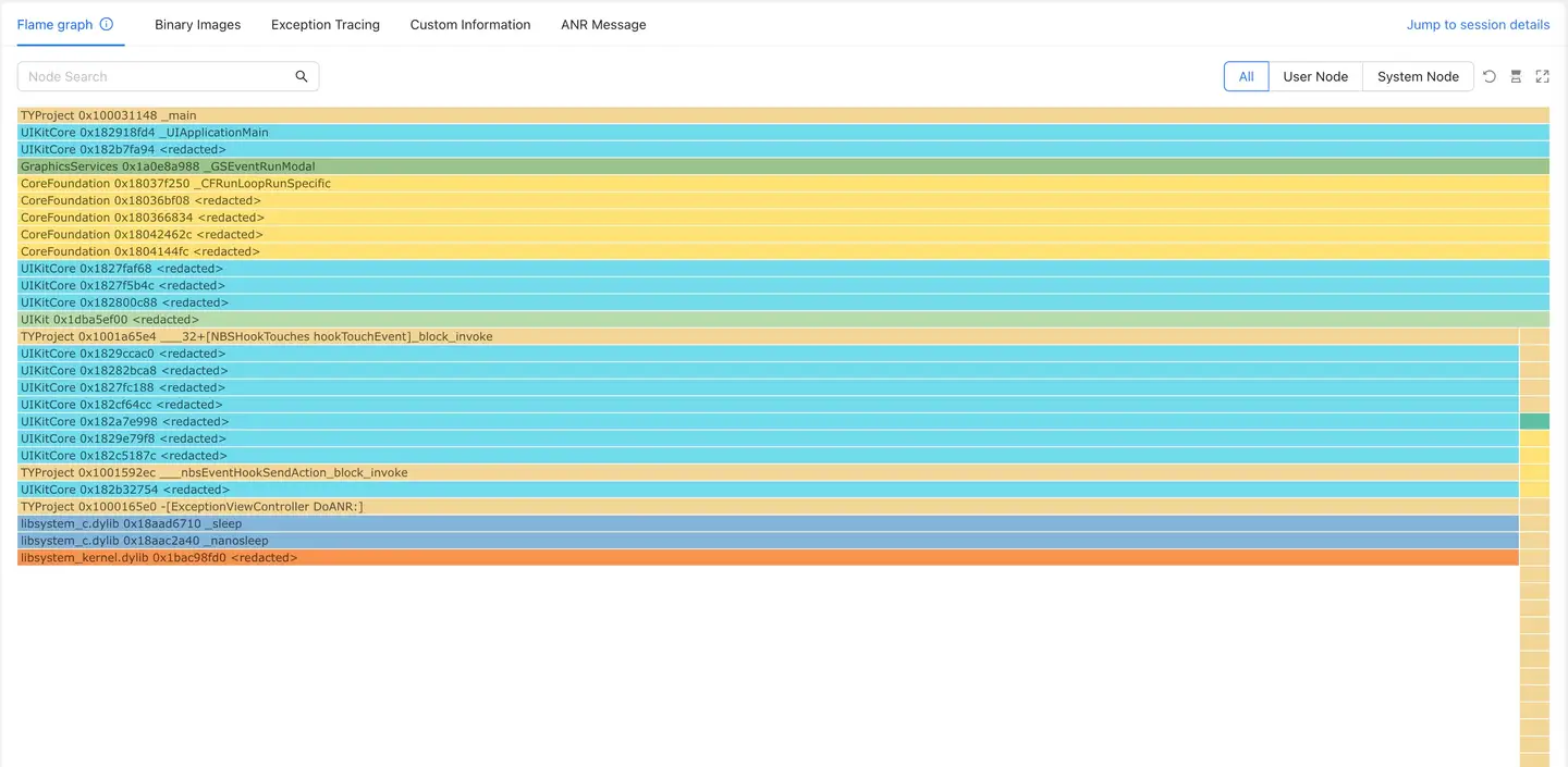 In order to quickly and accurately locate the code location where the application crashes, stutters and errors occur, the Tingyun uses the symbol table file to parse and restore the application crash, stutter and error stack. Click in the upper right corner Symbol table management of the list to upload the symbol table. Automatic symbol table uploading is also supported. An example of the restore effect is as follows: