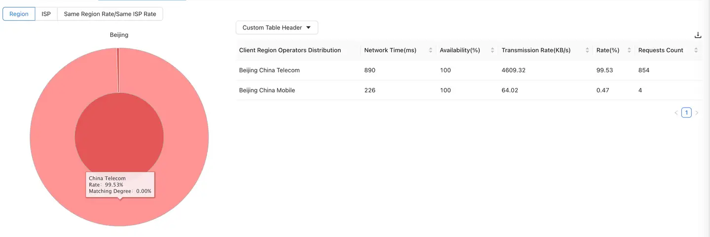 | Operator | Compare whether the information of the operator in the selected region is matched with that of the CDN node operator | Number of requests from the same operator / Total number of requests |
