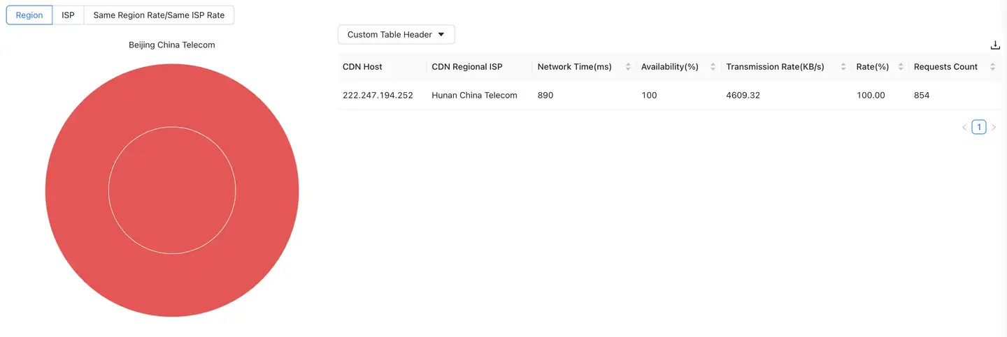 List It mainly analyzes the problems of cross-regional access and cross-operator access of CDN nodes, and provides the pie charts of "same region and different regions" and "same operator and different operators", as well as the corresponding node list. The list supports user-defined header, and the indicator to be displayed can be selected through Customize the header the drop-down menu. Click the icon in the upper right corner to download the current list data to the local in Excel form. At most 10000 pieces of data can be downloaded.