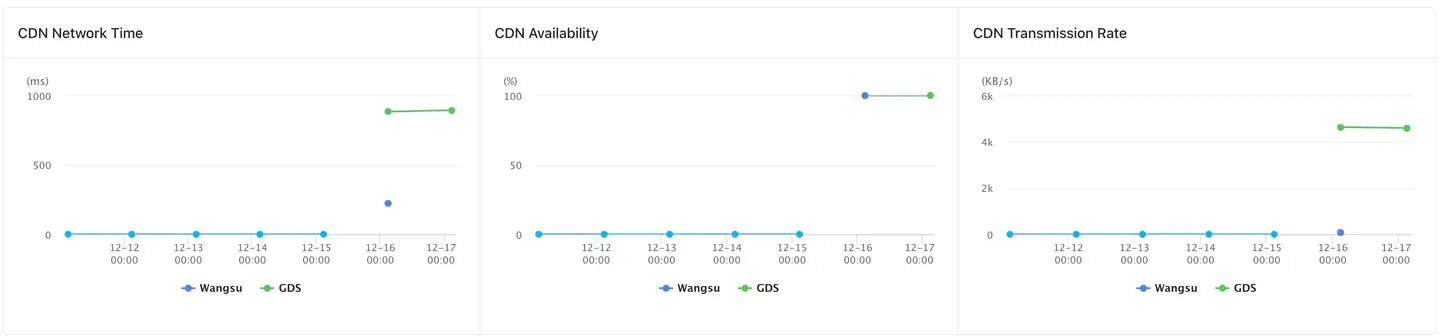 CDN quality assessment displays the change trend chart of "CDN network time", "CDN availability" and "CDN transmission rate" to comprehensively evaluate the quality of CDN vendors.
