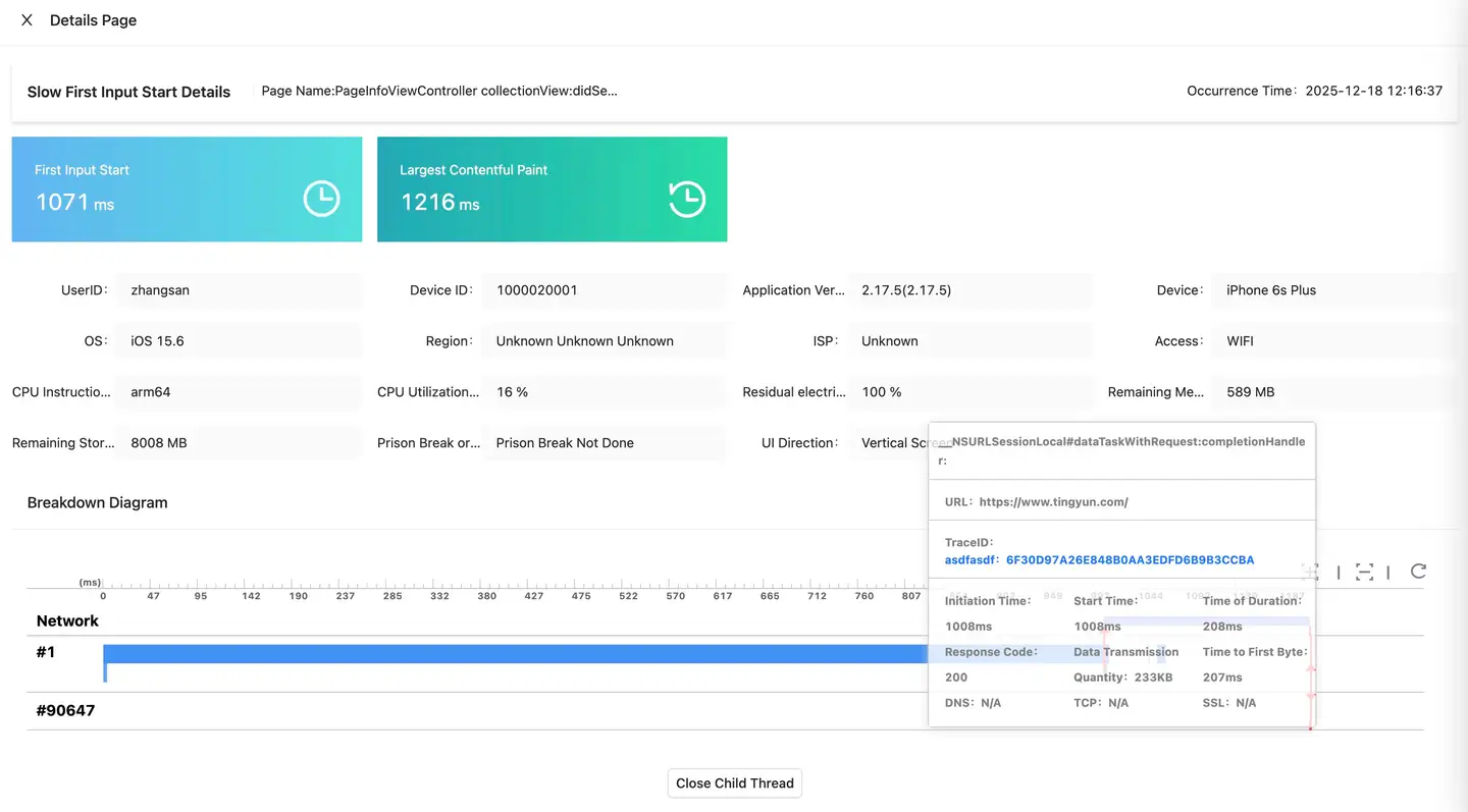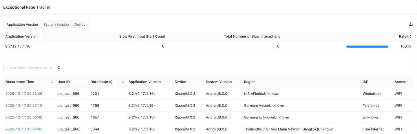 The Exceptional Page Tracking helps you understand the proportion of slow interactive or slow first screen occurrences in application versions, devices, and operating systems, and provides a detailed single-sample list to help developers locate the root cause of slow interactive or slow first screen samples. The list supports querying based on UserID.