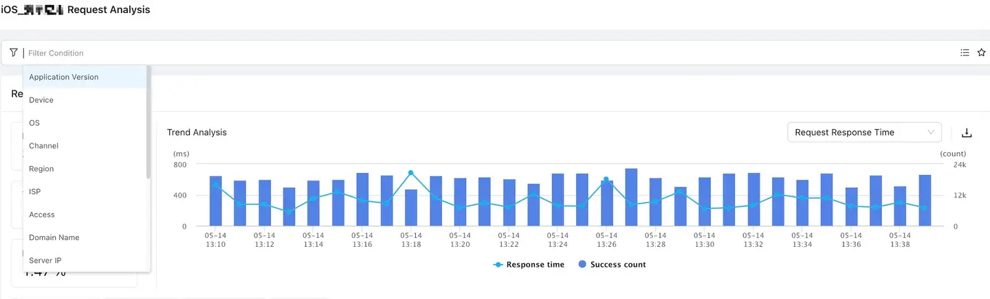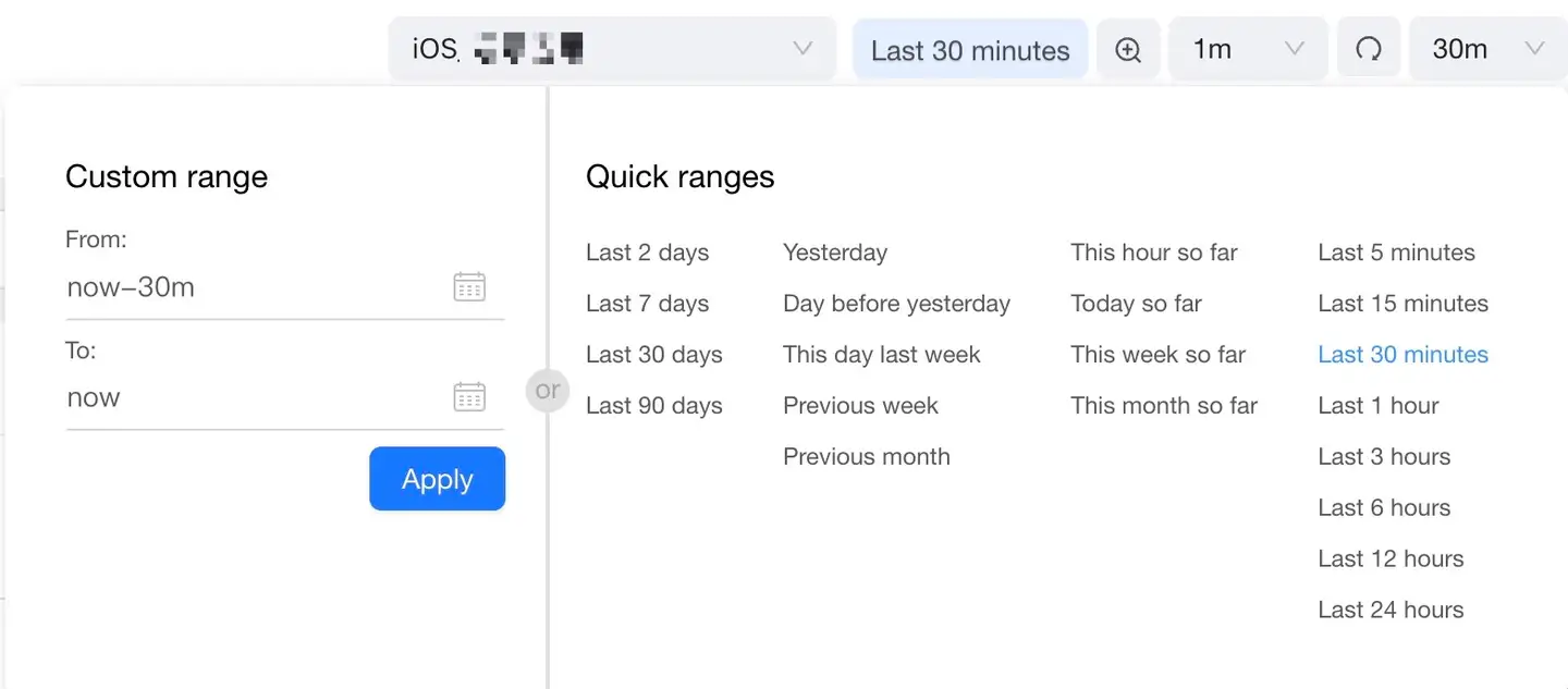 App products can store the performance monitoring data of the last 90 days. Within this interval, you can specify any statistical period to query the monitored data. App product provides two statistical period selection methods: custom time range and quick query time range.