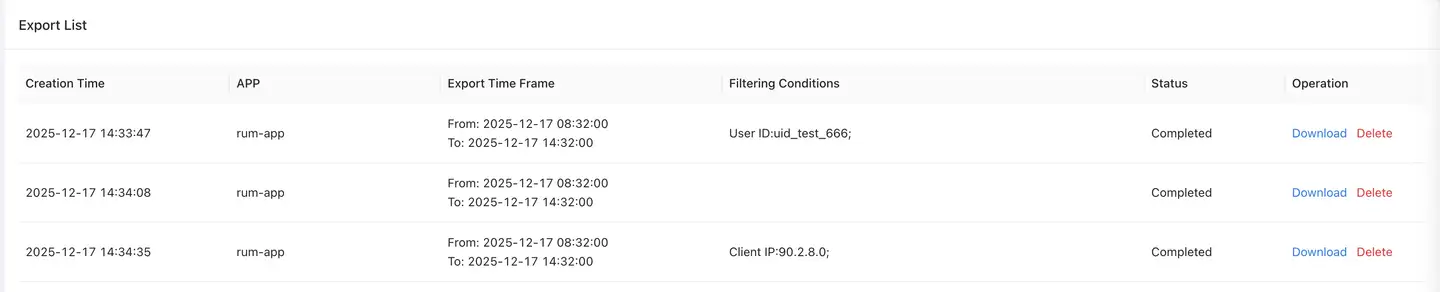 Support exporting query list to CSV format. Click the button in the upper right corner Export of the tracking list. After checking the category to be exported, the system will create an export task and display it in the export list. When the Status column displays Completed, you can download the zip package by clicking the download link in the Action column. At any time, you can click the button in the upper right corner Export the list of the tracking list to view the export progress, download the list, or delete the export task.
