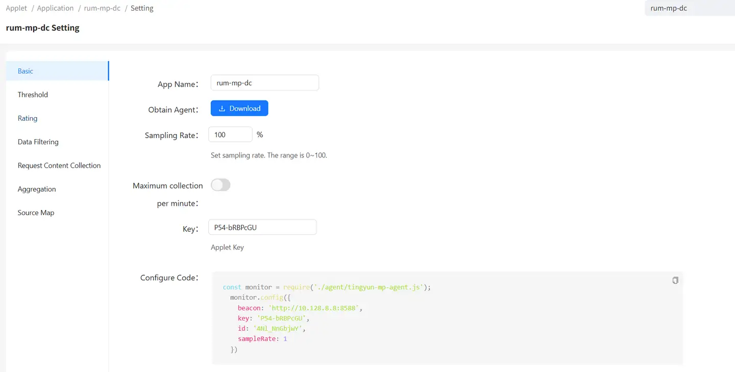 Click on the application settings corresponding to the app in the mini-program list to configure the basic settings, threshold settings, and rating settings for that application.