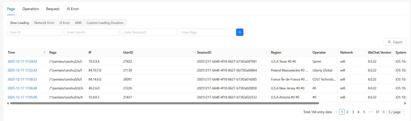 Through user tracking, it is possible to view users' page interactions and individual action data via three filtering methods: IP, UserID, and SessionID. Additionally, detailed views of these interactions can be provided.