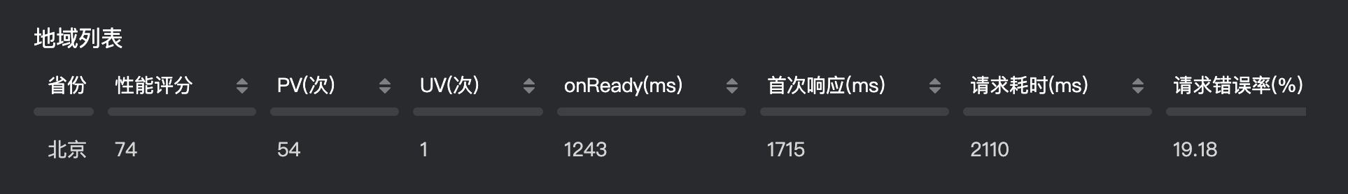 该模块可分析各地域运营商网络环境下各指标性能情况,可切换分析的指标有小程序性能评分、PV、onReady、首次响应、请求耗时、请求错误率、JS错误率,也可以切换运营商和网络类型(4G、3G、2G、WiFi)。点击地域名称,即可查看该地域的性能详情。如果有多个国家用户访问即展示为世界地图。若只有一个国家,多个省份用户访问,则展示国家地图。若只有一个省份用户访问,则展示为省份地图。